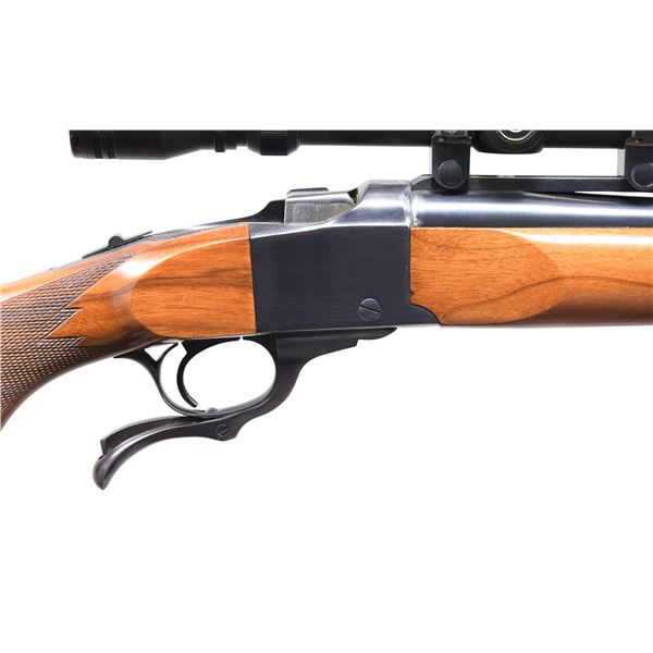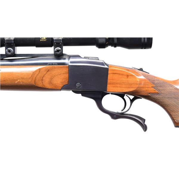 Cal. 270 Win. S# 131-47930. Bbl. 26" round w/ quarter rib. Simmons 8 POINT 3-9x40 matte finished scope w/ duplex reticle on Ruger rings. Semi-beavertail forearm & straight grip stock of nicely grained walnut w/ cut checkering, steel grip cap, solid red pad & swivel bases. CONDITION: 97% blue showing muzzle wear & small marks. Wood finish shows numerous scratches & marks on forend. Very good bright bore. Scope has clear optics. (24-5827/DS). MODERN. $1,000-1,300.