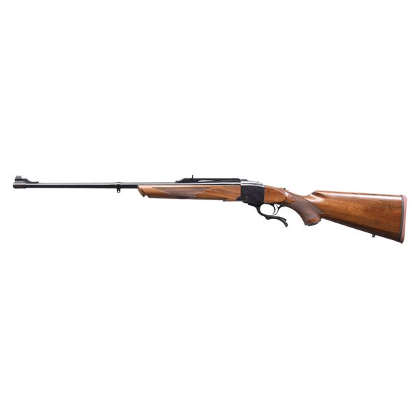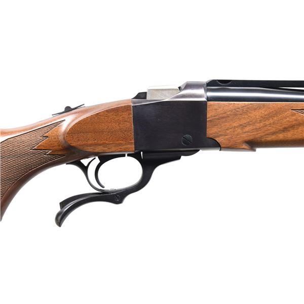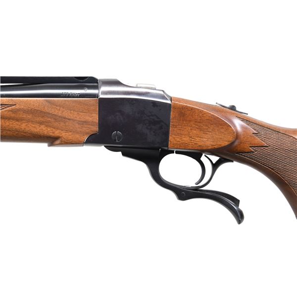 WITH MATCHING FACTORY BOX. Cal. 275 Rigby. S# 134-46860. Bbl. 24". No. 1 (No. 1-A) single shot breechloading rifle mfg. by Ruger in 2016. Top of bbl. is marked with Ruger's mfg. information, with the cal. designation marked on the left at the breech. Receiver is marked "RUGER" within a banner above "No. 1" over the top of the chamber. Metal components exhibit a blue finish overall, save for the breechblock, which is polished in-the-white. Checkered wood pistol grip buttstock and forend. Ramped brass beaded blade front sight with flip-up U-notch rear sight on half rib. UNATTACHED ACCESSORIES: matching factory box. CONDITION: fine, with metal components retaining virtually all of their original factory blue finish overall. Brilliant mirror bore, exhibiting well defined rifling throughout. Wood furniture is excellent overall. Box shows some mild exterior wear from handling and storage, but otherwise remains sturdy and serviceable. (24-3187/MLW). MODERN. $600-900.