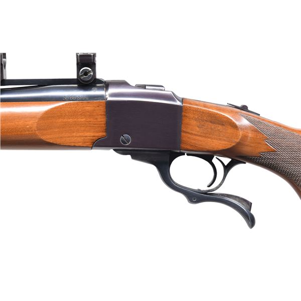 Cal. 30.06. S# 130-40620. Bbl. 26" round w/ quarter rib & Ruger rings. Semi-beavertail walnut forearm w/ capped pistol grip stock, cut checkering, solid red pad & swivel bases. CONDITION: 97% original blue. Stock finish shows light wear & small marks. Very good bright bore. (24-5747/DS). MODERN. $1,000-1,300.