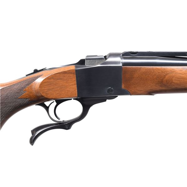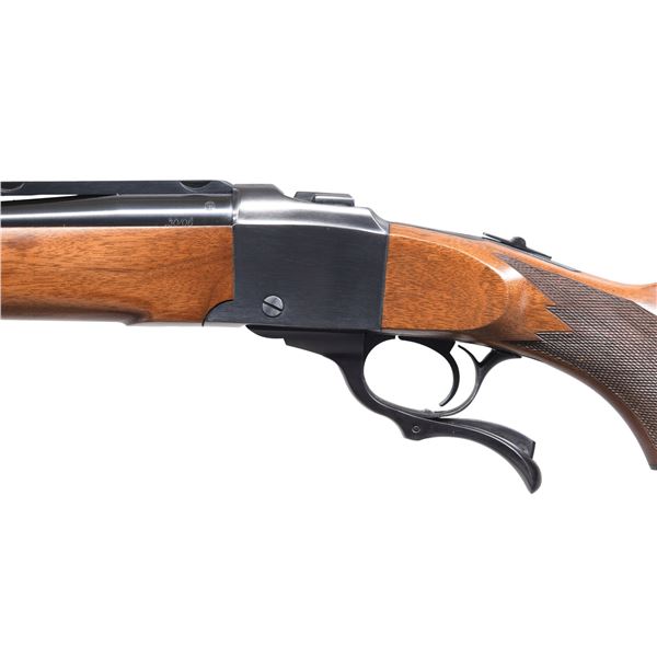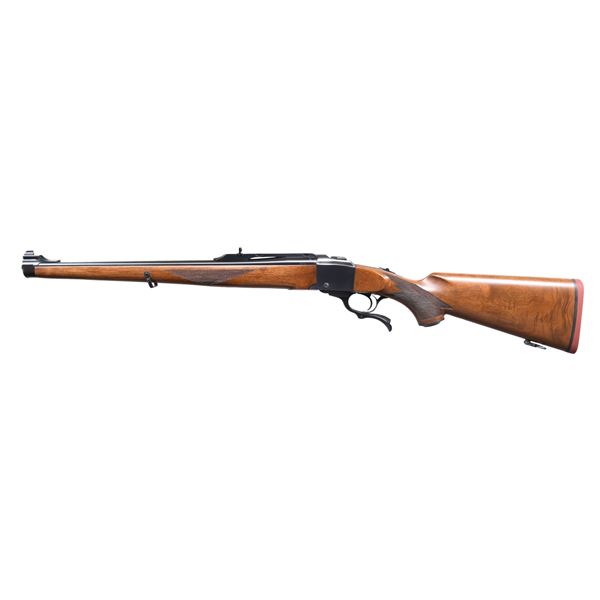 Cal. 30.06. S# 132-68550. Bbl. 20". Ramp mounted bead front sight w/ quarter rib mounted folding leaf rear sight. Full length walnut forearm & steel capped pistol grip stock w/ cut checkering & solid red pad. Forearm has a sling swivel loop. Stock has QD swivel. CONDITION: near excellent retaining over 98% wood & metal finish. Near excellent bore. (24-5699/DS). MODERN. $1,200-1,800.