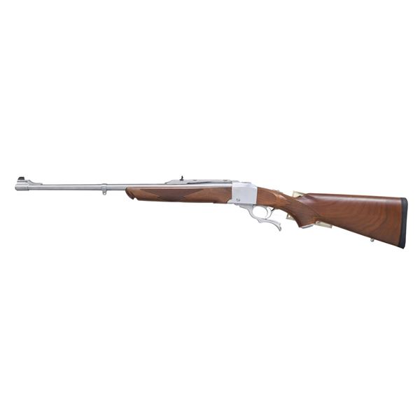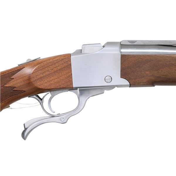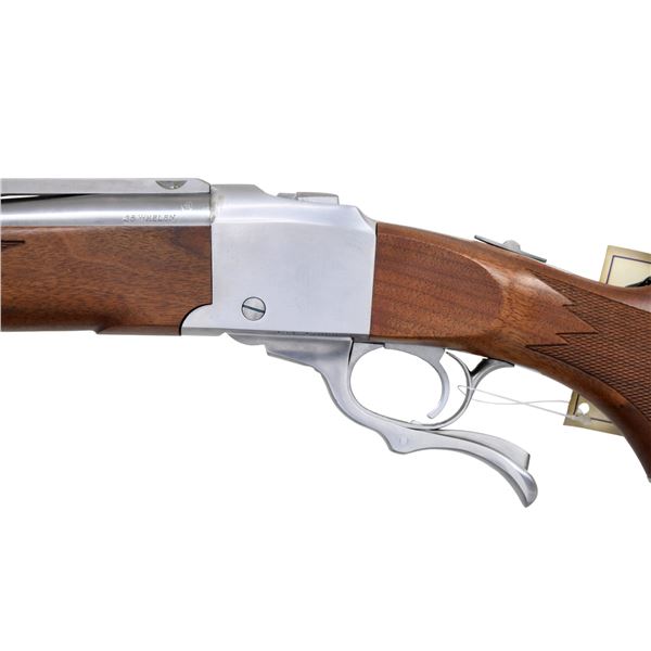 Cal. 35 Whelen. S# 134-17880. Bbl. 22". Ramp mounted bead front sight w/ folding leaf rear sight on quarter rib. Alexander Henry forearm & pistol grip walnut stock w/ swivel bases, grip cap & black pad. UNATTACHED ACCESSORIES: original box containing owner's manual, warranty card, sling swivels, Ruger rings & safety lock. CONDITION: as new w/ box. (24-3276/DS). MODERN. $1,000-1,500.