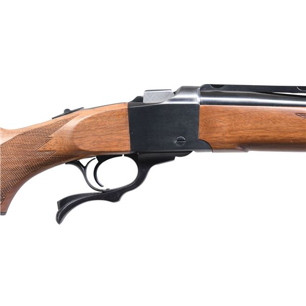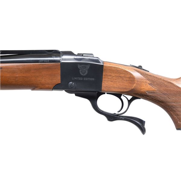 PATROL SINGLE SHOT RIFLE. Cal. 357 mag. S#. 132-43334. Bbl. 22" rd. w/ ramp mtd. bead front & folding leaf rear sight on quarter rib. Receiver has CA. Highway Patrol limited edition markings on left side. Front ring is marked "RUGER / No 1". Alexander Henry forend & capped pistol grip walnut stock w/ cut checkering, solid red pad & swivel bases. UNATTACHED ACC: original box containing owner manual & offer papers. (24-3595/DS). MODERN. $1500-2000.
