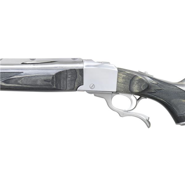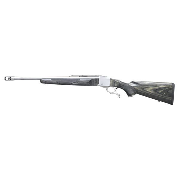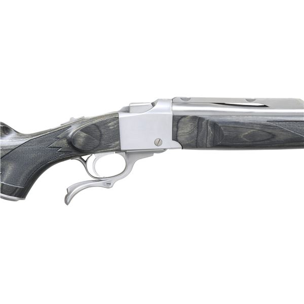 Cal. 450 Bushmaster. S# 134-49729. Bbl. 22" compensated w/ quarter rib. Satin stainless construction. Semi-beavertail forearm & pistol grip laminated stock w/ cut checkering, stainless steel grip cap, swivel bases & black pad. UNATTACHED ACCESSORIES: original box containing instruction manual, warranty card, offer papers, sling swivels, Ruger scope rings & safety lock. CONDITION: as new in box. (24-3325/DS). MODERN. $1,000-1,400.