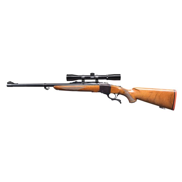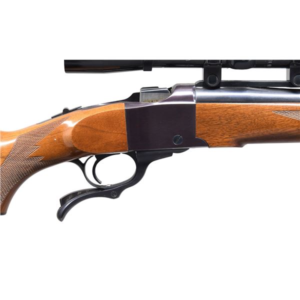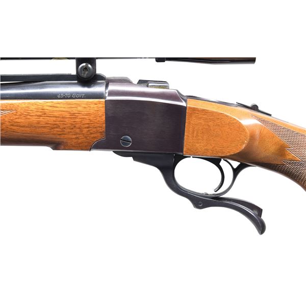 Cal. 45-70. S# 130-13113. Bbl. 22" medium weight. Ramp mounted bead front sight w quarter mounted rear sight. Bushnell sharpshooter 4x32 gloss finished scope w/ duplex reticle on Ruger rings. Alex Henry forearm & steel capped pistol grip stock w/ cut checkering, solid red pad & QD swivels. CONDITION: 98% wood & metal finish. Very excellent bore. Scope has clear optics & shows some exterior scratches. (24-5704/DS). MODERN. $1,000-1,400.