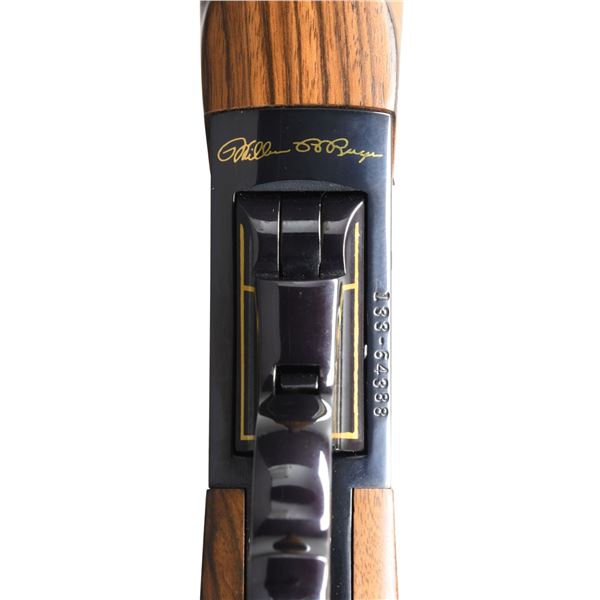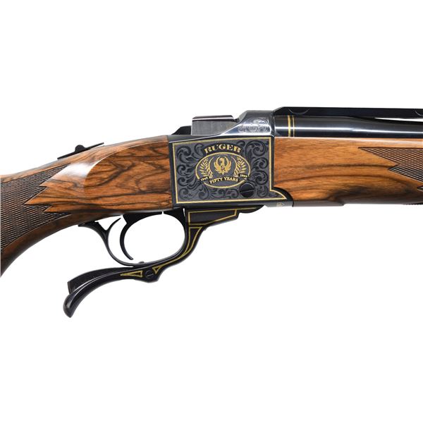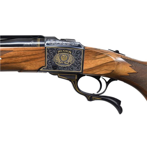 Cal. 45-70. S# 133-64388. Bbl. 22" round. Ramp mounted bead front sight w/ folding leaf rear sight on quarter rib. Action has special gold plated Ruger emblems & 50 year markings on sides w/ gold Ruger signature on bottom. Sides of action, lever along w/ breech & muzzle ends of bbls. have gold border highlights. Alexander Henry forearm & steel capped pistol grip stock of fine Circassian walnut having cut checkering, swivel bases & solid black pad. Limited edition of 1,500 mfg. 1999. UNATTACHED ACCESSORIES: original box containing instruction manual, warranty card, Ruger rings & safety lock. CONDITION: as new w/ box. (23-6828/DS). MODERN. $1,500-2,000.