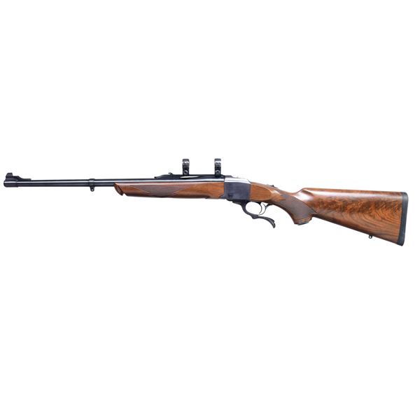 Cal. 45-70. S# 134-06960 (2005). This Ruger No. 1 rifle features a blued finish. It has a 22-inch barrel with Warning marks, a standard bead front sight, an flip up rear sight on quarter rib. The frame is blued with a checkered walnut stock set. The forearm is checkered and configured as a standard forearm. The buttstock is a pistol grip design with a checkered finish and a black rubber pad. UNATTACHED ACCESSORIES: Ruger rings. CONDITION: Overall, this rifle is in near excellent condition. The barrel retains approximately 95% of its original finish. The frame retains about 90% of its finish having plum tone. The forearm and buttstock are in excellent condition with minimal handling marks. The bore is bright with strong rifling. MODERN (24-2740/MD) $900 - $1,300.