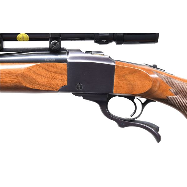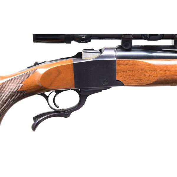 Cal. 6mm Rem. S# 130-31680. Bbl. 26" round w/ quarter rib. Bushnell Banner 4-12x40AO gloss finished scope w/ duplex reticle on Ruger rings. Semi-beavertail forearm & pistol grip stock of fancy walnut w/ cut checkering, steel grip cap, solid red pad & QD swivels. CONDITION: 97% blue showing muzzle wear. Very good wood finish w/ 1 gouge on bottom of forearm. Near excellent bore. Scope has clear optics. (24-5826/DS). MODERN. $1,000-1,400.