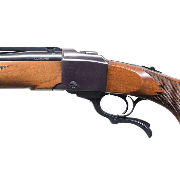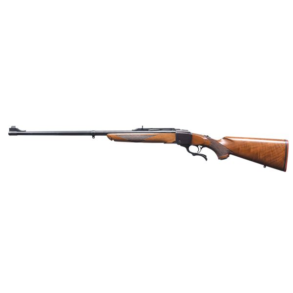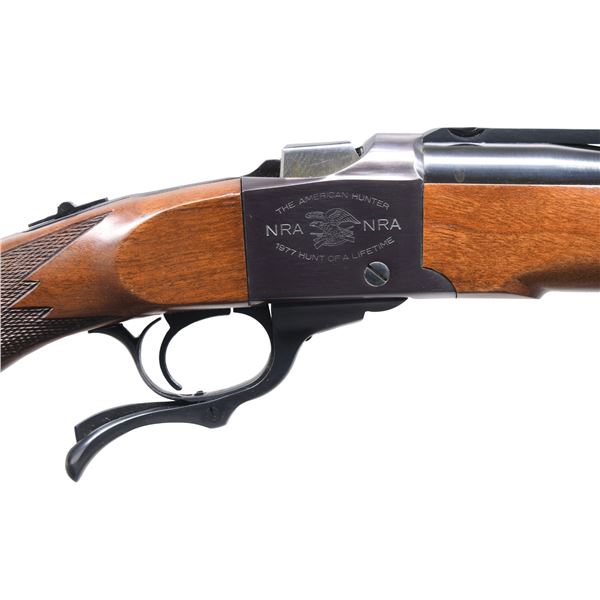 Cal. 7mm Rem Mag. S# NRA 103. Bbl. 26" w/ ramp mounted bead front sight & quarter rib mounted folding leaf rear sight. Left side of receiver has American eagle w/ NRA markings & the inscription "The American Hunter 1977 Hunt of a Lifetime". Alexander Henry forearm & pistol grip stock of fancy walnut. Features include cut checkering, steel grip cap, swivel bases & red pad. CONDITION: 99% original blue. Very good original stock finish showing a series of small dents on right ear. Very good bright bore. (23-6528/DS). MODERN. $1,000-1,500.