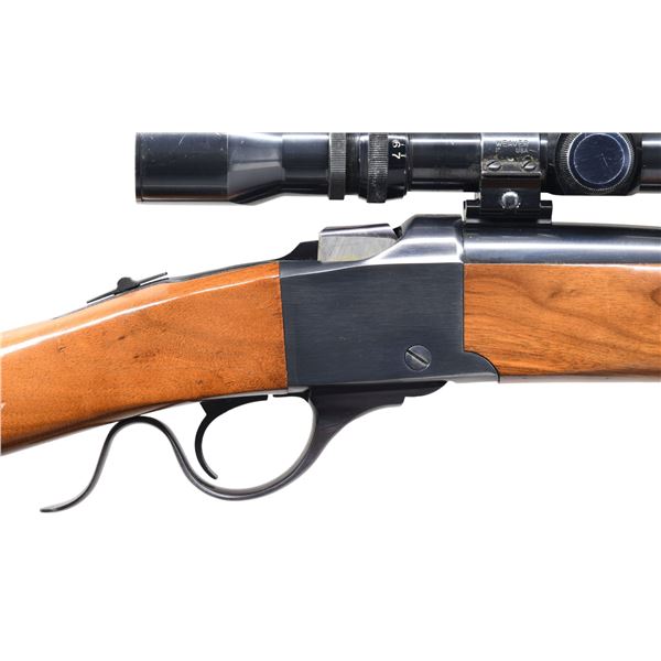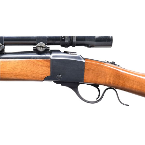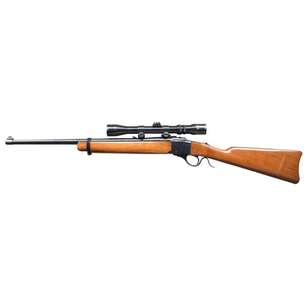 Cal. 30-40 Krag. S# 130-55907. Bbl. 22" round w/ ramp mounted bead front sight & folding leaf rear sight. Weaver Micro-Trac V7-IIW gloss finished scope w/ duplex reticle on Weaver mounts. Band fastened walnut forearm & straight grip stock w/ aluminum carbine buttplate. Bbl. is marked "MADE IN THE 200TH YEAR OF AMERICAN LIBERTY". CONDITION: over 95% blue. Original wood finish shows a few small marks. Bright near excellent bore. Scope shows carry wear on blue & has clear optics. (24-5744/DS). MODERN. $800-1,200.