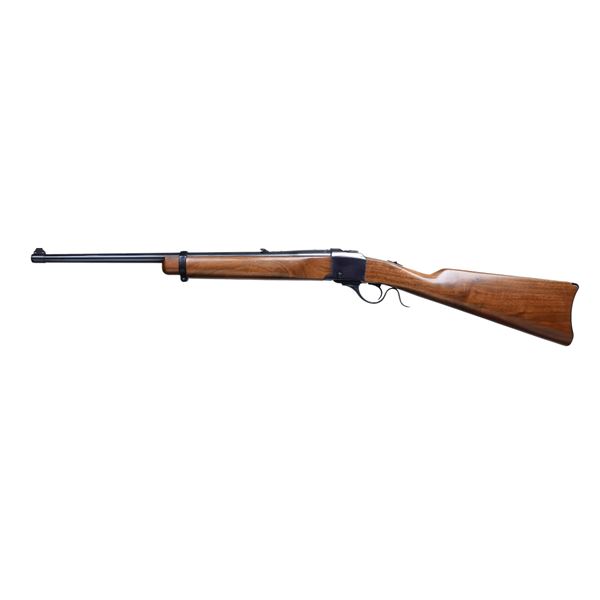 MATCHING BOX. Cal. 30-40 Krag. S# 130-63670 (1977). This Ruger No. 3 rifle features a blued finish. It has a 22-inch barrel with a standard bead front sight and an adjustable rear sight; D&T behind rear sight. The frame is blued with a smooth walnut stock set. The forearm is standard with barrel band. The buttstock is a straight grip design with a smooth finish and a Celcon buttplate. UNATTACHED ACCESSORIES: Factory box. CONDITION: Overall, this rifle is in near excellent condition. The barrel retains approximately 95% of its original finish. The frame retains about 95% of its finish having plum tone. The forearm and buttstock are in excellent condition with minimal handling marks. The bore is bright with strong rifling. MODERN (23-6456/MD) $500 - $700.
