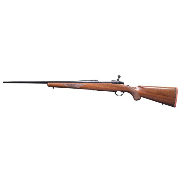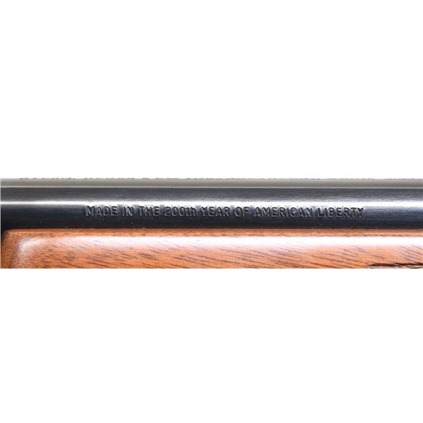 Cal. 257 Roberts. S# 72-34358. Bbl. 22" without provision for sights; marked "MADE IN THE 200th YEAR OF AMERICAN LIBERTY". Mfg. 1976 (1968-1992) with tang safety, receiver factory machined for Ruger scope rings and blued finish. Checkered walnut stock with grip cap, sling studs and red rubber butt pad. UNATTACHED ACCESSORIES: original box (split ends) with packaging to include scope rings in factory red felt bag. CONDITION: all aspects near excellent appearing new and unfired. (24-3500/NW). MODERN. $750-1,000.