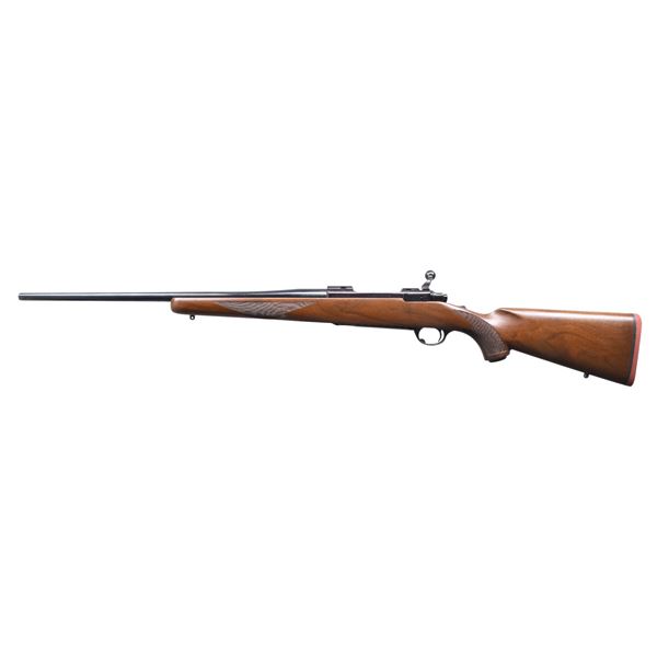 Cal. 280 Rem / 7mm Exp Rem. S# 74-90593. Bbl. 22". Model 77 bolt action rifle mfg. by Ruger in 1980. The top of the bbl. is marked with Ruger's mfg. information, with the cal. designation marked on the left towards the breech. Left side of the receiver is marked with the S#, followed by "RUGER M77". Metal components exhibit a blue finish overall, save for on the bolt and extractor, which are polished in-the-white, as well as on the trigger guard and floorplate, which exhibit a black enamel type finish. 1-piece wood pistol grip stock, with checkered panels at the wrist and forearm. Tang safety, with integral dovetailed scope mount on receiver. CONDITION: extremely fine, with metal components retaining bountiful amounts of their original factory finishes overall. Side of extractor exhibits a few small spots of light surface level pitting, but is otherwise fine. Brilliant mirror bore, retaining well defined rifling throughout. Wood stock is excellent overall. (24-2819/MLW). MODERN. $700-1,000.