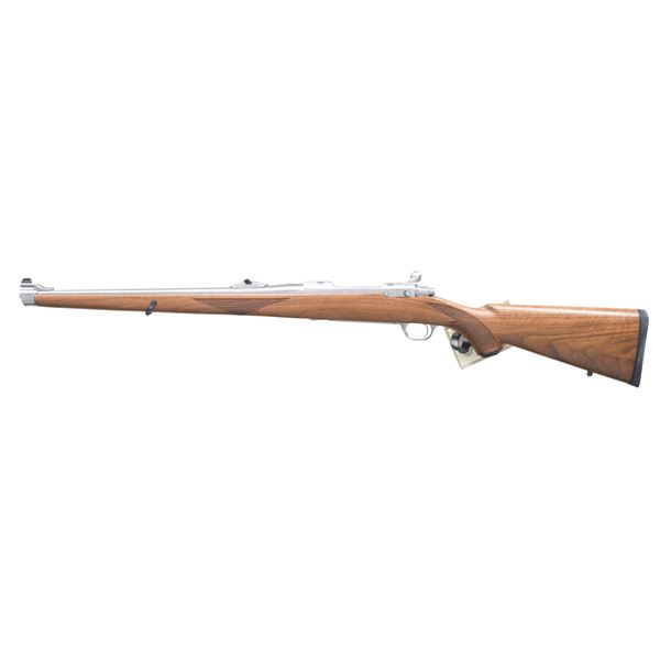ACTION RIFLE. Cal. 257 Roberts. S# 792-11869. Bbl. 18 1/2". Ramp mounted bead front sight w/ island mounted folding leaf rear sight. Action features 3 position safety & bases for Ruger rings. Stainless steel construction. Full length walnut stock w/ cut checkering & black pad. UNATTACHED ACCESSORIES: original box containing instruction manual, warranty card, sling swivel, Ruger rings & safety lock. CONDITION: as new w/ box. (24-3074/DS). MODERN. $500-800.