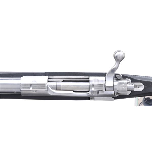 Cal. 300 Rem. SA Ultra Mag. S# 790-46280. Bbl. 22" without provision for sights; receiver factory machined for Ruger scope rings. Mfg. 2003 as Model 17811 with checkered black Zytel stock having grip cap, sling studs and black rubber buttpad. UNATTACHED ACCESSORIES: factory box and packaging to include Ruger scope rings. CONDITION: all aspects near excellent appearing new and unfired. (24-3055/NW). MODERN. $550-800.