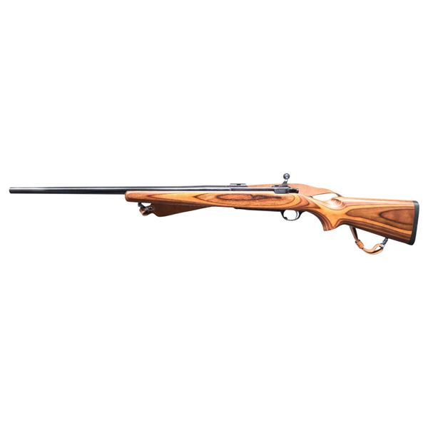 ACTION RIFLE. Cal. 308 Win. S# 771-93359. Mfg. 1989 as Model 00762. Heavy 24" barrel without sights. Tang safety action fitted for Ruger rings. Laminated hardwood stock with Ruger black pad & brown leather sling on swivels. UNATTACHED ACCESSORIES: manual. CONDITION: all aspects very good to near excellent with minor handling marks. Very good shiny bore. (25-226/MD). MODERN. $500-800.