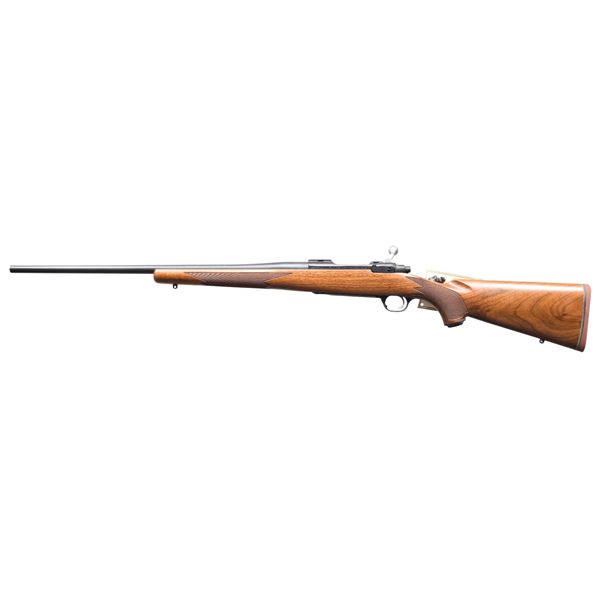 Cal. 22-250. S# 710-14680. Bbl. 22" w/o sights. Matte blue finish. Action features 3 position safety & bases for Ruger rings. Checkered walnut stock w/ red pad. UNATTACHED ACCESSORIES: original walnut box containing instruction manual, warranty card, NRA card, trigger lock & Ruger rings. CONDITION: as new w/ box. (23-6457/DS). MODERN. $500-700.