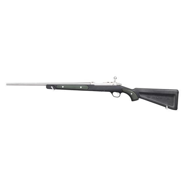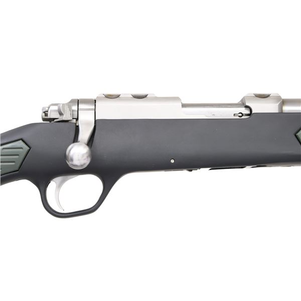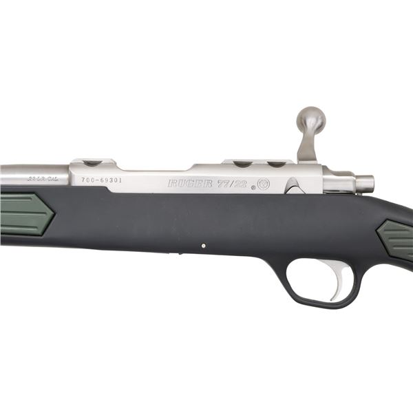 Cal. 22 LR. S# 700-69301. Bbl. 20". Model 77/22 bolt action rifle mfg. by Ruger in 1988. Top of the bbl. is marked with Ruger's mfg. information, with the cal. designation marked on the left at the breech. Left side of the receiver is marked with the S# followed by "RUGER 77/22" and the Ruger logo. Metal components exhibit a stainless steel finish overall. Black polymer buttstock features OD-grooved grip panels. MAGS: 1 10-rd. UNATTACHED ACCESSORIES: matching factory box. CONDITION: excellent, with metal components retaining bountiful amounts of their original factory finish, exhibiting some superficial marks from handling and storage. Brilliant mirror bore, exhibiting well-defined rifling throughout. Stock is very good, showing a few superficial marks from handling and storage. Box shows age-related discoloration and some mild exterior wear, but otherwise remains sturdy and serviceable. (23-6544/MLW). MODERN. $400-600.