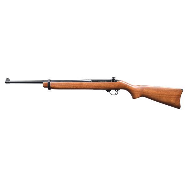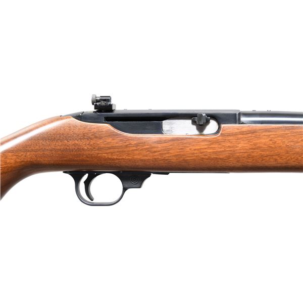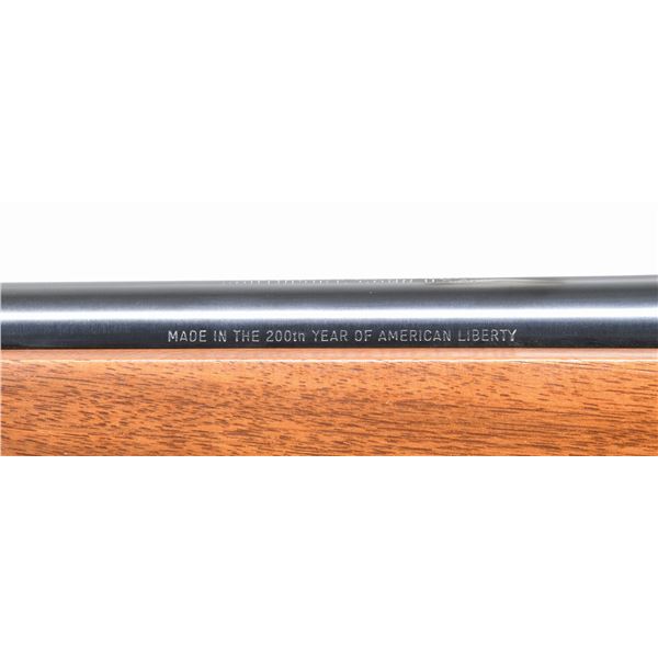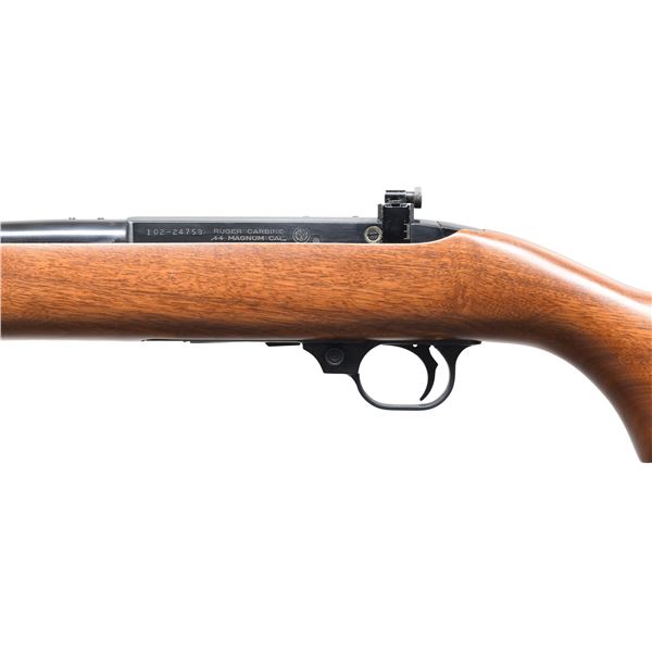 SEMI-AUTO CARBINE. Please note as of 4/9/25 this item description has been updated. Please revisit this description and contact us with any questions. Cal. 44 Mag. S# 102-24758. Bbl. 18 1/2" with brass bead front sight, no dovetail at rear of barrel for folding sight plus receiver machined for receiver sight of Williams 5D configuration. Left midpoint of barrel marked "MADE IN THE 200TH YEAR OF AMERICAN LIBERTY". Mfg. 1976 (1961-1985) and shipped 2010 as sold in a Ruger benefit auction on Gunbroker. Per RENE Reference Guide, one of the rarest of Rugers with only 1 known other than this one! Proper features including: uncheckered walnut carbine stock having square cut forend and black Celcon carbine buttplate, riveted in receiver cartridge guide, button cartridge release in loading area and the rare receiver sight. Very popular and collectable fast handling, brush hunting carbine that weighs less fully loaded than the popular lever action carbine weighs empty! Very special Ruger carbine! UNATTACHED ACCESSORIES: 50th year box (likely for 10/22 Carbine) with factory bar coded label indicating Model 01012 with catalogue designation 44RS plus 4/82 dated manual additionally marked "out of production" in red ink. CONDITION: all aspects near excellent appearing new and unfired. (23-6837/NW). MODERN. $1,500-2,500.