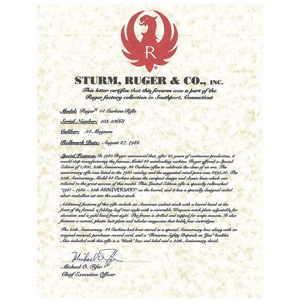 CARBINE. Cal. 44 Mag. S# 103-10668. Bbl. 18 1/2" with brass bead front sight and folding leaf rear; right rear adjacent to receiver has "1961-1985" over "25TH ANNIVERSARY". Mfg. 1985 (1961-1985) and shipped 2003 as the result of a Ruger benefit auction conducted on Gunbroker. Approx. 5,000 Anniversary Models issued to clean up remaining inventory before its discontinuance. Proper features including: uncheckered walnut carbine stock having square cut forend and black Celcon carbine buttplate, riveted in receiver cartridge guide and button cartridge release in loading area. Very popular and collectable fast handling, brush hunting carbine that weighs less fully loaded than the popular lever action carbine weighs empty! UNATTACHED ACCESSORIES: original box with newer Ruger bar code label applied over part of original (still readable). Engraved violet colored metal tag from Southport Loan Archives. Manual dated 4/82; original without red "out of production" markings. Shipping sleeve to FFL dealer in CO. CONDITION: all aspects near excellent with new, unfired appearance. (23-6800/NW). MODERN. $800-1,200.