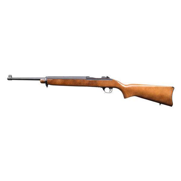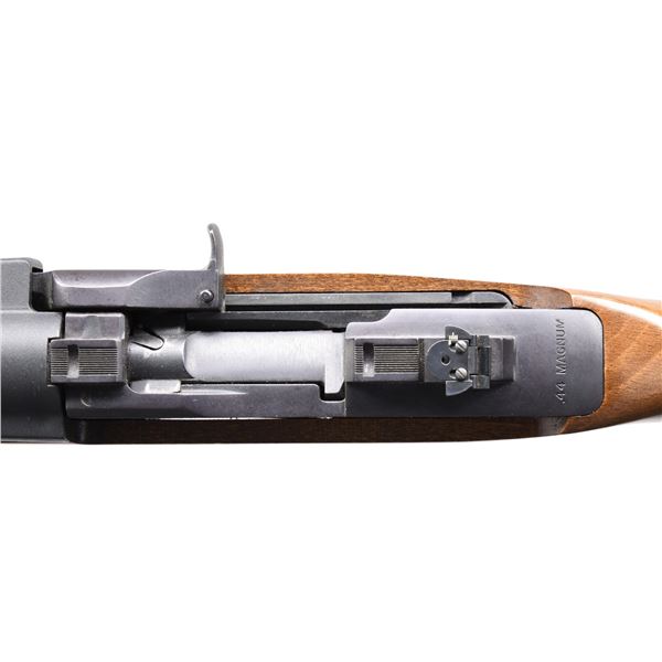 SEMI-AUTOMATIC CARBINE. Cal. 44 Mag. S# 630-08623. Bbl. 18 1/2". Model 99/44 Deerfield semi-automatic rifle mfg. by Ruger in 2001. Left side of the receiver is marked with the S#, followed by "RUGER DEERFIELD CARBINE", with the cal. designation marked behind the rear sight. Metal components exhibit a matte blue finish. Plain wood pistol grip buttstock with black polymer handguard. Brass beaded blade front sight, with flip-up aperture rear sight. MAGS: 1 4-rd. CONDITION: very good, with metal components retaining the majority of their original factory blue finish, exhibiting some light to mild wear from cycling of the action, as well as some scattered superficial handling marks. Mirror bore, exhibiting well-defined rifling throughout. Stock is very good, save for some handling marks and a small crack that runs from the mag. to the front receiver screw. Polymer handguard shows a few marks from handling and storage, but otherwise is good overall. (23-6337/MLW). MODERN. $800-1,400.