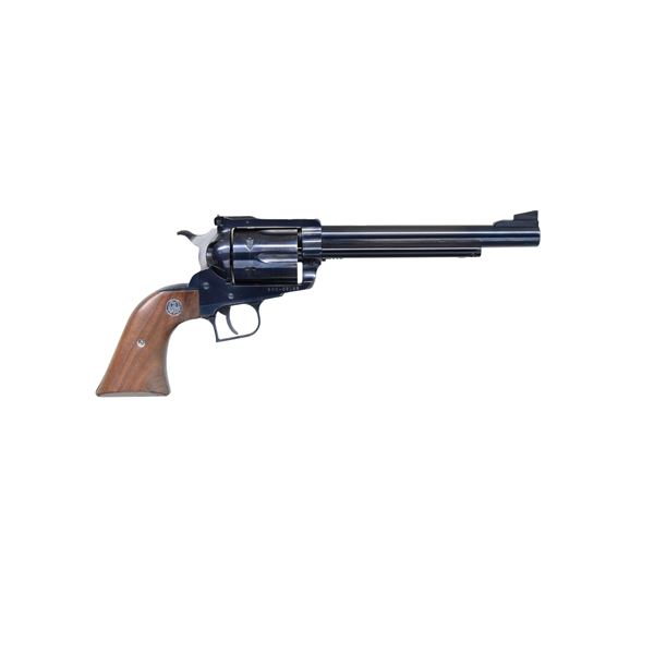 REVOLVER. Cal. .357 Rem. Maximum S# 600-02168 (1983). Features include a blued finish, 7.5 inch barrel, ramp front sight, and adjustable rear sight. Frame configuration is standard with no special designations. Cylinder holds 6 rounds and is fluted. Grips are smooth wood with Ruger medallions. UNATTACHED ACCESSORIES: Factory box. CONDITION: Overall condition is near excellent. The barrel retains approximately 98% of its finish. Frame shows about 97% finish coverage. Grips are near excellent. Bore is bright with sharp rifling. MODERN (23-6682/MD) $700-$1000.