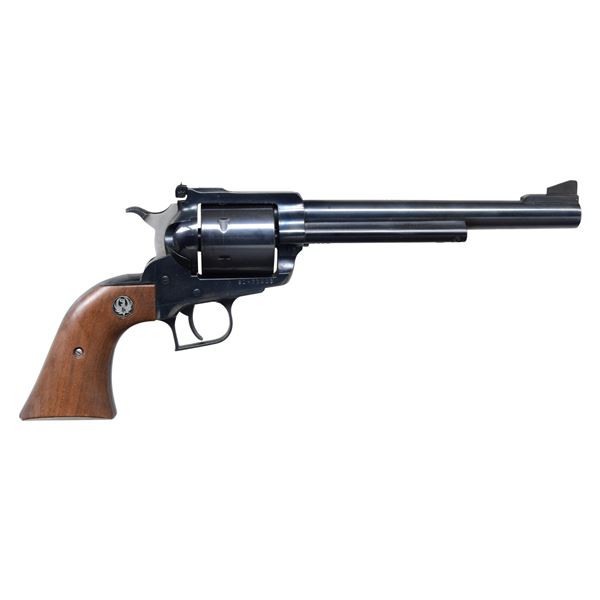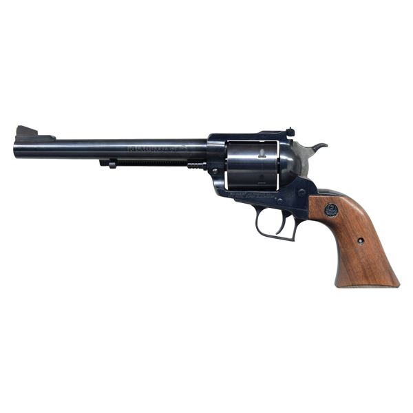 REVOLVER. Cal. .44 Mag. S# 81-77603. Manufactured by Sturm, Ruger & Co. from 1973 to present. Features a blued finish. Barrel length is 7.5 inches. The front sight is a ramped blade and the rear sight is an adjustable notch. It has a standard trigger and a spurred hammer. The cylinder is unfluted and holds six rounds. The grips are smooth walnut with Ruger medallions. UNATTACHED ACCESSORIES: very good to excellent matching numbered factory red 1 piece box with 5-76 manual. CONDITION: Overall condition is very good with approximately 95% of the original blued finish remaining on the barrel and frame. The grips show minor handling marks. The bore is bright with strong rifling. MODERN (23-6716) $350-550.