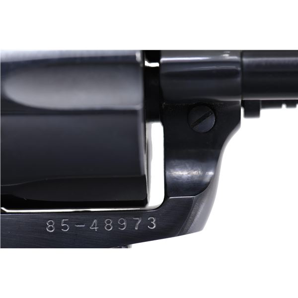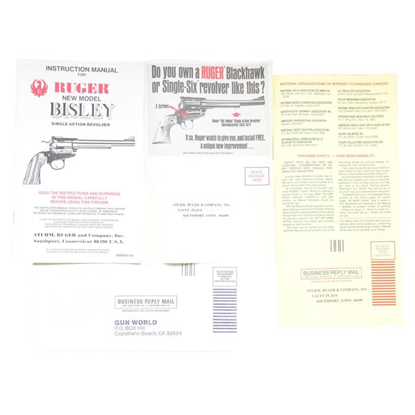 REVOLVER Cal. 44 Mag. S# 85-48973 (1985). This revolver features a blued finish. It has a 7.5-inch barrel, ramp front sight, and adjustable rear sight. The trigger is smooth, and the hammer is the Bisley-style hammer. The frame is the Ruger Bisley configuration. The cylinder holds six rounds and is fluted. The grips are smooth walnut with Ruger medallions. UNATTACHED ACCESSORIES: Factory box, instruction manual, and promotional literature. CONDITION: Overall, this revolver is in near excellent condition. The barrel retains about 95% of its original blued finish. The frame retains about 95% of its blued finish. The grips are in near excellent condition. The bore is bright with strong rifling. MODERN (23-6584/MD) $400-$600.