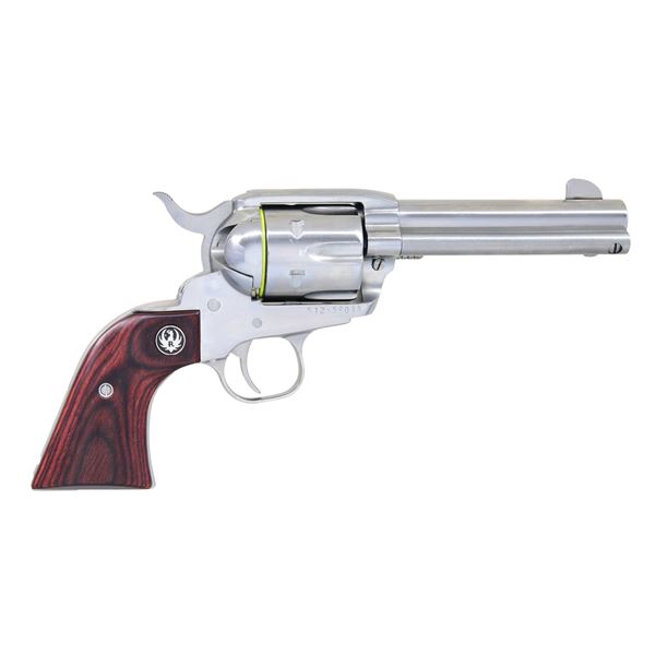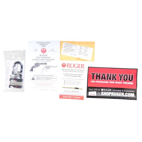 Cal. 45 COLT S# 512-59018. This revolver features a stainless steel finish. The Ruger New Vaquero series was introduced in 2005 and continues to be produced. This specific model has a 4-5/8 inch barrel, a blade front sight, and a notch rear sight. It is equipped with a single-action trigger and a traditional spurred hammer. The cylinder holds 6 rounds and is fluted. The grips are smooth rosewood with Ruger medallions. UNATTACHED ACCESSORIES: Factory box, instruction manual, lock, promotional material. CONDITION: Overall condition is excellent grips in excellent condition with no visible wear, and a bright bore with strong rifling. MODERN (23-6111). $400-600.