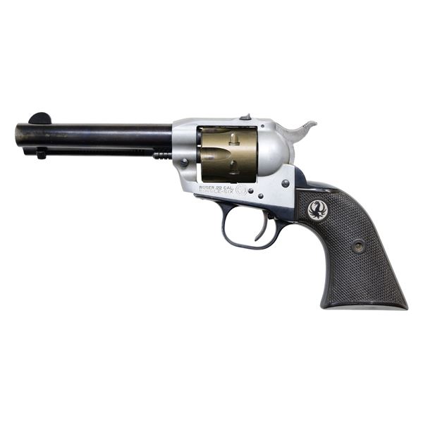 Cal. 22 LR. S# 200163. Bbl. 4-5/8" with blade sight and without "INC." in address; drift adjustable notched rear sight properly retained by set screw under top strap rather than by friction as done with steel models. Mfg. 1956 (1956-1959 for all Lightweights) as first variation (3,700 units) with serrated ejector rod head, golden brown Martin Hard Coat on its all alloy cylinder and flat loading gate. Lightweights numbered in 200000 series with about 21,000 made to later include 2 all blue variations: LWAC (Lightweight Alloy Cylinder) and LWSC (Lightweight Steel Cylinder). Standard Tri-Colored features include natural finished alloy cylinder frame, steel long throw offset ejector housing, non drilled through base pin latch, early "skinny" curved trigger and black XR3 grip frame with checkered hard rubber grips. Very desirable early example (#163) with original lockwork; not factory safety updated. Lightweight Single-Six was way ahead of its time by Ruger and not well received by buyers due to unfounded concerns about aluminum's durability. CONDITION: very good original finish with minimal marks on the cylinder. Slight finish loss at muzzle and fading or thinning on barrel. Couple of faint high point wear marks on grip frame. Minimal paint loss on black eagles of grip medallions and slight firing residue near firing pin bushing plus at rear of barrel. Light staining on sides of hammer. Near excellent bore and grips. (23-6250/NW). CURIO. $750-1,000.