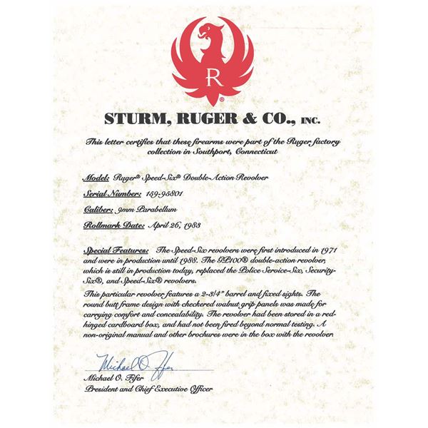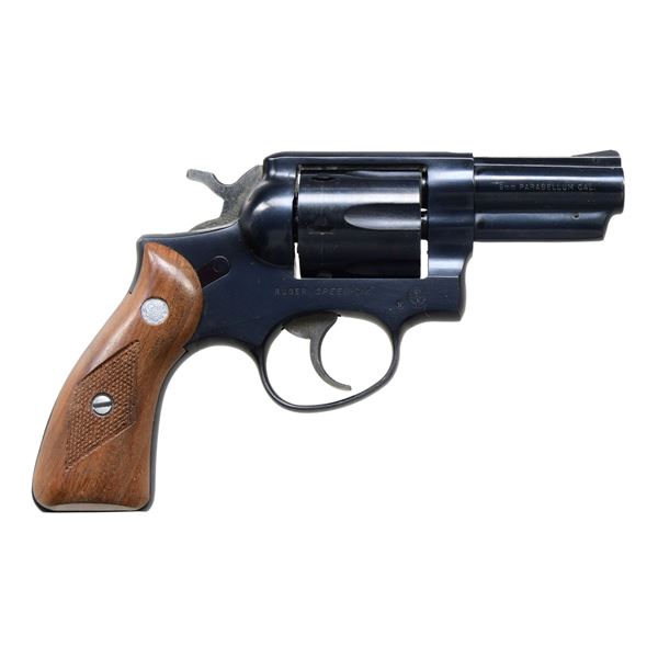 Cal. 9mm Parabellum. S# 159-95801 (2011). This revolver features a blued finish. It has a 2.75-inch barrel, ramp front sight, and fixed rear sight. The trigger is smooth, and the hammer is standard. The frame is a standard Ruger Speed-Six configuration. The cylinder holds six rounds and is fluted. The grips are checkered walnut with Ruger medallions. UNATTACHED ACCESSORIES: Factory box, instruction manual, and safety literature. CONDITION: Overall, this revolver is in excellent condition. The barrel retains about 98% of its original blued finish. The frame retains about 98% of its blued finish. Cylinder has faint turn line. The grips are in excellent condition with sharp checkering. The bore is bright with strong rifling. MODERN (23-6590/MD). $400-$600