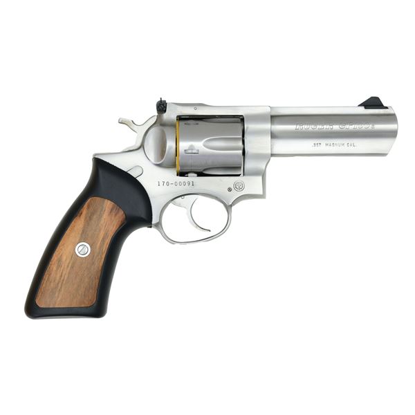 REVOLVER WITH FACTORY BOX & MATCHING SHIPPING BOX, FORMER HENRY RODESCHIN COLLECTION. Cal. 357 Mag. S# 170-00091. Bbl. 4 1/8". Model GP100 double action revolver mfg. by Ruger in 1987. Left side of the bbl. is marked with Ruger's mfg. information, with "RUGER GP100" above the cal. designation on the right. Right side of the frame is marked with the S# "170-00091" ("91" being former Ruger factory employee Henry Rodeschin's personally assigned factory S#) and the Ruger logo. Metal components exhibit a stainless steel finish overall. Frame is mounted with 2-piece black rubber grips that feature smooth wood panels on either side. Ramp front sight with adj. square notch rear sight. UNATTACHED ACCESSORIES: factory box and matching shipping box. CONDITION: excellent, with metal components retaining bountiful amounts of their original factory finish, exhibiting some superficial handling marks overall and a light dragline on the cyl. Mirror bore, exhibiting well-defined rifling throughout. Grip is excellent overall. Box and shipping box show some light exterior wear but otherwise remain sturdy and serviceable. PROVENANCE: Amoskeag Auction Company, Auction #136, Lot #1590. (23-6090/MLW). MODERN. $500-800.