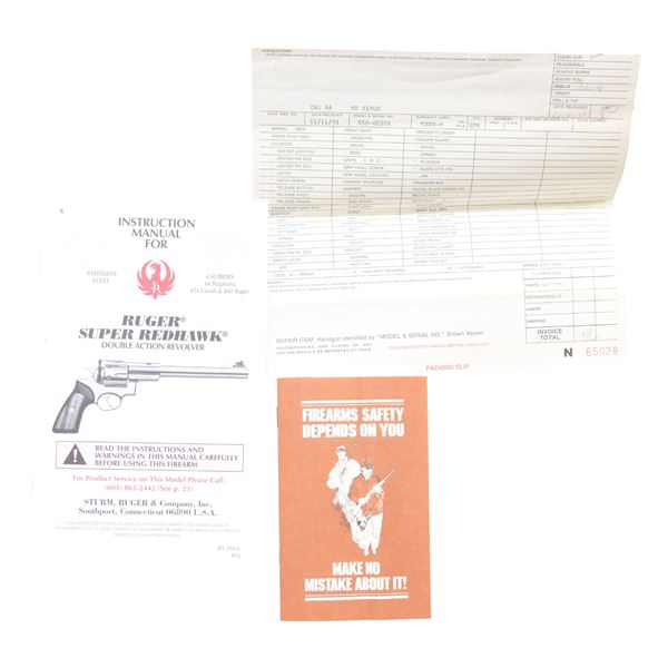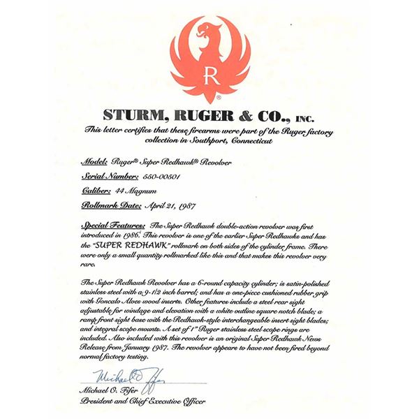 CAL. .44 MAG. S# 550-00501. This Ruger Super Redhawk Double Action Revolver features a stainless steel finish and was produced April 21, 1987. The barrel length is 9.5 inches with a ramp front sight and an adjustable rear sight. It has a double-action trigger and a polished hammer. The frame is a standard configuration. The cylinder holds six rounds and is fluted. The grips are rubber with wood inserts. UNATTACHED ACCESSORIES: Factory repair box, instruction manual, and repair packing slip. Ruger factory letter CONDITION: Overall condition is excellent. The barrel retains nearly all of its original finish. The frame shows about 95% finish remaining. The grips are in excellent condition with minimal handling marks. The bore is clean with strong rifling. MODERN (23-6579/MD). $500-800.