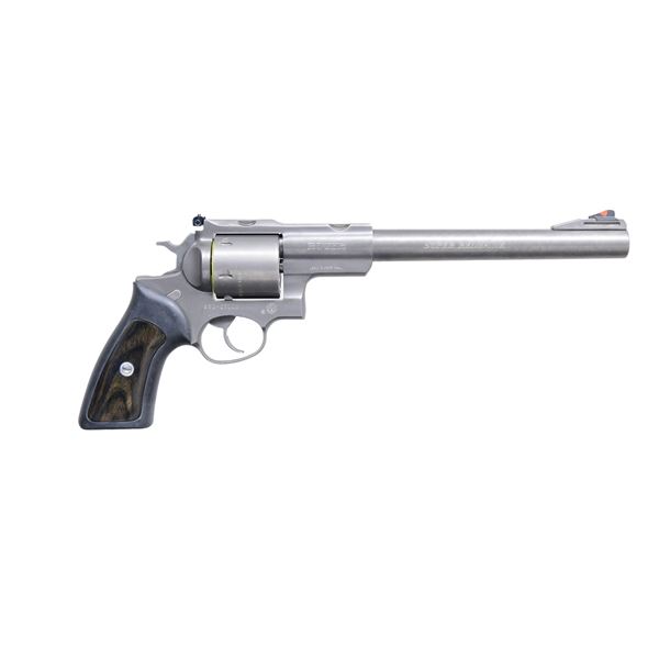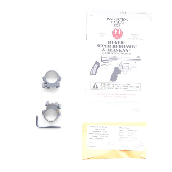 MATCHING BOX. Cal. 480 Ruger. S# 552-07113 (2009). Catalog No. KSRH-9480. The Ruger Super Redhawk is a double action revolver featuring a target grey finish. The barrel length is 9.5 inches with a ramp front sight and an adjustable rear sight. It has rubber grips with laminate wood inserts. The frame is a standard Ruger frame without special naming. The cylinder holds six rounds and is not fluted. UNATTACHED ACCESSORIES: Factory box, instruction manual, scope rings, and wrench. CONDITION: The revolver is in near excellent overall condition with 98% of its original finish remaining. The barrel retains 98% of its target grey finish. The frame also retains 98% of its target grey finish. The grips are in excellent condition. The bore is bright and shiny with strong rifling. MODERN. (24-2952/MD) $500-800.