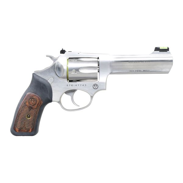 Cal. .327 Fed. Mag. S# 576-47743. This model features a stainless finish, production began in 1989. It has a 4.2-inch barrel with a green fiber optic front sight and an adjustable rear sight. The revolver is equipped with a standard trigger and hammer. The cylinder holds six rounds and is fluted. The grips are checkered wood with a Ruger medallion and black rubber overlays. CONDITION: Overall excellent with 99% original stainless finish on the barrel and frame. Grips are excellent with sharp checkering. Bore is bright and clean. MODERN (23-6116) $400-600.