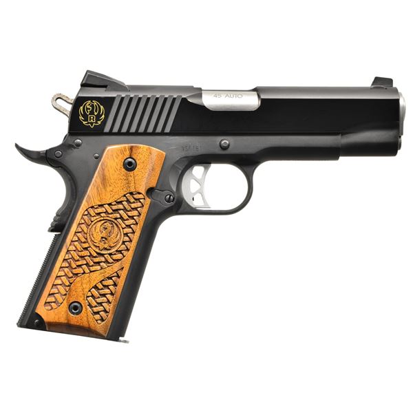 PISTOL. Cal. 45 ACP. S# NSF181. Bbl. 4.25" stainless (bushing, too) throated. Mfg. 2014 as Model 06704 and distributed by Davidson's as a limited edition of 500 units (NSF001 to NSF500) to raise money for the Navy Seal Foundation (NSF). For each pistol sold, $100 was donated to the Foundation. Commander is configured of stainless steel with a high gloss DLC black coating on the slide (matte on the frame); at the rear is the Ruger logo on the right and the NSF logo on the left (both in gold). Standard Ruger enhanced SR1911 features include an integral plunger tube, checkered flat mainspring housing, beavertail grip safety with memory pad, extended thumb safety, flared and lowered ejection port, extended magazine release, skeletonized hammer, and trigger with overtravel adjustment. Dovetailed 3-dot sight set with Novak-style drift-adjustable rear sight. Grips are laser-engraved French walnut with Ruger logos and basket weave gripping surfaces. MAGS: 2 factory bright stainless 7 rd. UNATTACHED ACCESSORIES: matching numbered factory box with packaging to include NSF and Davidson's materials. CONDITIONS: all aspects are near excellent; appears new and unfired. (23-6185/NW). MODERN. $650-900.