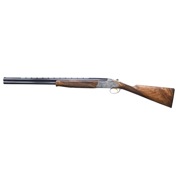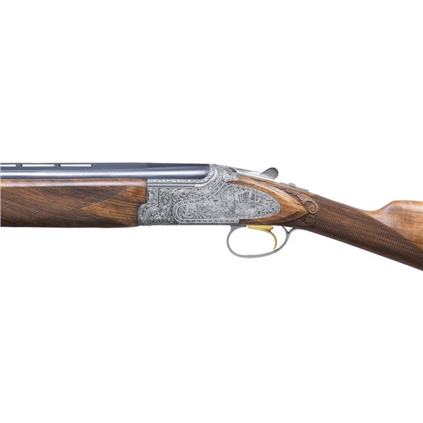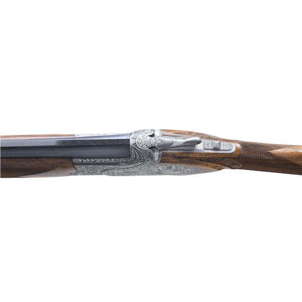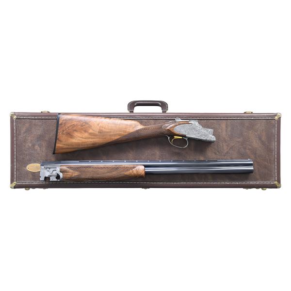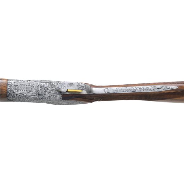 Cal. 20 ga. 2 3/4" & 3". S# 15811MZ131. Bbl. 26" vent rib w/ white target front sight. Full set of five tubes included. Custom sideplated boxlock action w/ full coverage engraving by Ron Reimer. Right sideplate features a detailed woodland scene w/ three quail. Left scene shows three pheasants. Trigger guard bow shows a portrait of a rooster pheasant. Floorplate shows a portrait of a setter. Scenes are surrounded by masterful full coverage foliate scroll engraving w/ finely matted backgrounds & elaborate borders. Engraving continues to trigger guard tang, forearm iron & breech areas of bbls. Ron Reimer was trained as a gunsmith at the Colorado School of Trades. He later worked for Herter's until their bankruptcy. In 1990, he began working for Browning Arms in Arnold, Missouri, retiring in 2011 he moved to Wyoming where he still engraves Browning firearms. The President of Browning Arms called Ron a "master engraver in every way". Gold plated SST. Selective ejectors. Schnable tipped forearm & straight grip stock of satin finished fancy thin shell walnut w/ silver nameplate in toeline. Stock & forearm have fine wraparound hand engraving w/ borders, leaf carving w/ stippled backgrounds around the stock ears. LOP: 1 1/8" to a Browning buttplate. DAC: 1 3/8". DAH: 1 15/16". Neutral cast. WEIGHT: 6 lbs, 8.2 oz. UNATTACHED ACCESSORIES: Browning luggage case. Also included is a colored photocopy from Gun Digest magazine depicting Ron Reimer's masterworks. Also included is an original foam-lined Browning box containing spare chokes, choke wrench & owner's manual packet. CONDITION: near excellent as upgraded, retaining virtually all wood & metal finish. Bright near excellent bores. (25-926/DS). MODERN. $8,000-12,000.
