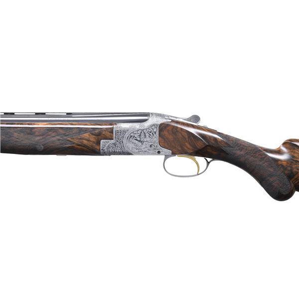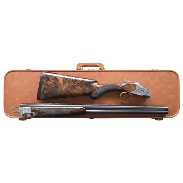 O/U SHOTGUN. Cal. 20ga 3". S# 63442V71. Bbls are 26 1/2" vent rib w/ white front sight. Aftermarket Briley choke tubes; set of 4 stainless steel tubes and wrench are included. Original choke markings are SKEET & IC. Satin gray finished boxlock action has stunning full coverage engraving by former Browning master engraver Angelo Bee. Outstanding relief cut scenes consists of game scene showing two dogs with flushing and falling pheasants on right side. Left side scene shows a fox carrying a partridge returning to her pups. Floorplate scene shows two dove. Trigger guard scene shows a pheasant perched on a limb. Balance of receiver has eye catching relief carved oak leaves and ornate leaf pattern borders. Complimentary engraving extends to top lever, trigger guard, forearm iron and breech section of bbls. Both sides of receiver have engraver's signature "A. Bee". Gold plated "SST". Selective ejectors. Non-automatic safety. Trim lightning style forearm and round knob long tang stock of exhibition quality European walnut w/ energetic marble & grain w/ reddish and brown tones highlighted by vivid dark streaking. Stock and forearm have fine point pattern hand checkering. LOP: 14 5/8" over a thin leather cover pad. DAC: 1 1/2". DAH: 2 3/16". Neutral cast. WEIGHT: 6lb 0.8oz. Manufacture date 1971. UNATTACHED ACCESSORIES: housed in a Browning case. Case contains black documents envelope w/ instructions and case tag. Also contains spare chokes, choke wrench, and case keys. CONDITION: near excellent as upgraded in the Browning Custom Shop. Retaining virtually all metal finish. Sound mechanics. Bright near excellent bores. PROVENANCE: from the Estate of Jon Thomas, Gunsport, LTD. (25-1081/DS). MODERN. $7,000-11,000.