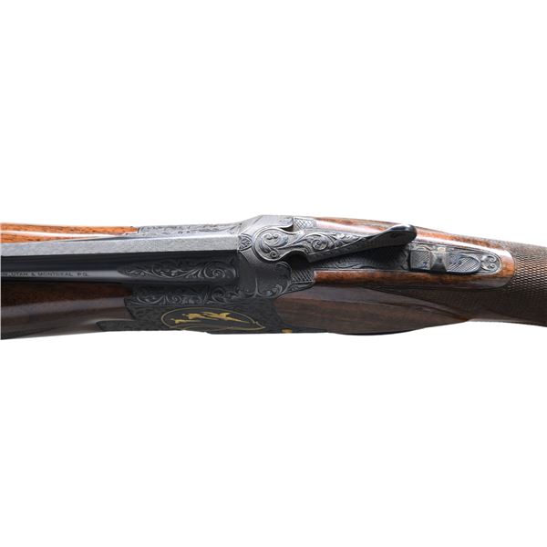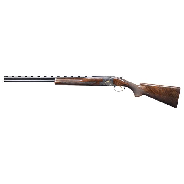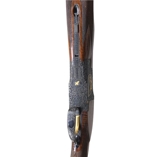 Cal. 410. 2 1/2". S# 6398 V71. Bbls. 26 1/2" vent rib w/ fixed Skeet & Skeet chokes. White front & mid beads. Midas grade hand engraving by Browning master engraver Richard Kowalski. Engraving features three raised gold flying mallards on the right side w/ three raised gold flying pheasants on the left side. Scenes are surrounded by gold wire borders. Floorplate has a raised gold flying duck. Balance of action along w/ forearm iron & breech end of bbls. have vine type foliate engraving. Trigger guard & forearm iron pins are gold plated. Gold plated SST. Selective ejectors. New style target beavertail forearm & flat knob short tang stock of gloss finished exhibition grade walnut w/ fancy point pattern hand checkering. LOP: 14 1/8" to a checkered butt. DAC: 1 5/8" DAH: 2 3/8". Stock has approx. 1/8" cast off. WEIGHT: 6 lbs, 10 oz. Mfg. 1971. UNATTACHED ACCESSORIES: two 410 ga. snap caps. CONDITION: near excellent showing no evidence of salt. Metal retaining 99% original finish. Original stock finish shows a few small scratches & handling marks. Bright near excellent bores. (25-1394/DS). CURIO. $7,000-11,000.