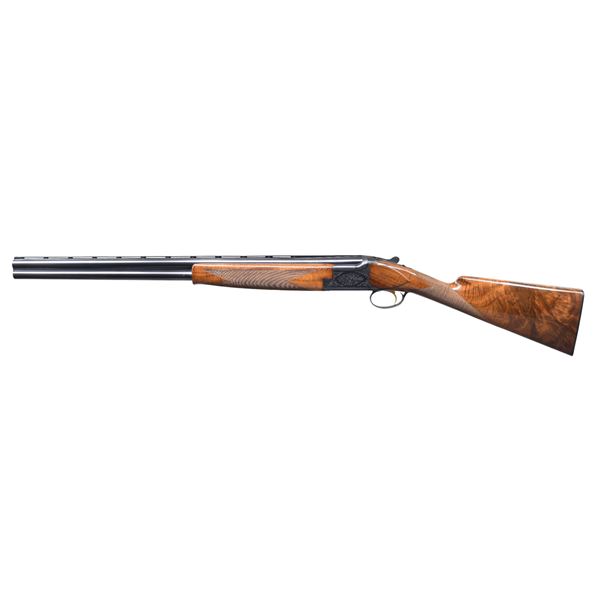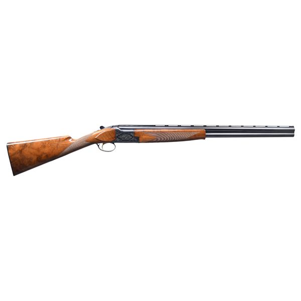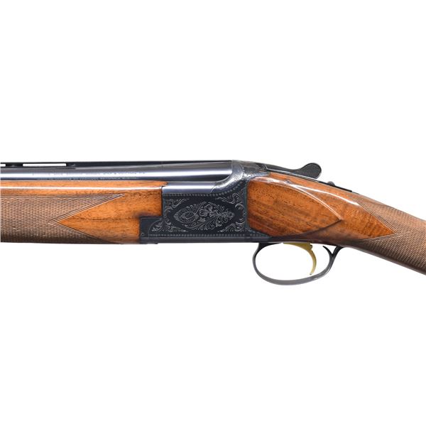 Cal. 12 ga. 2 3/4". S# 203PX02344. Bbls. 26 1/2" vent rib w/ steel bead. Fixed IC & Mod chokes. Blued action w/ grade one scroll engraving. Gold plated SST. Ejectors. Schnable tipped forearm & straight grip stock of fancy gloss finished walnut w/ hand checkering & original buttplate. Mfg. 1983 in Belgium. UNATTACHED ACCESSORIES: non-matching foam-lined Browning box. CONDITION: near excellent retaining over 98% original blue. Original wood finish shows small marks w/ a grain check on left side of butt. Tight action w/ top lever sitting right of center. Bright near excellent bores. (25-902/DS). MODERN. $2500-3500.
