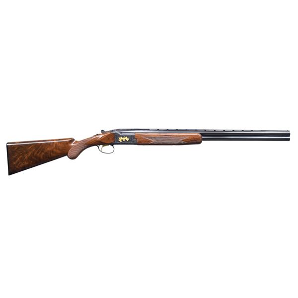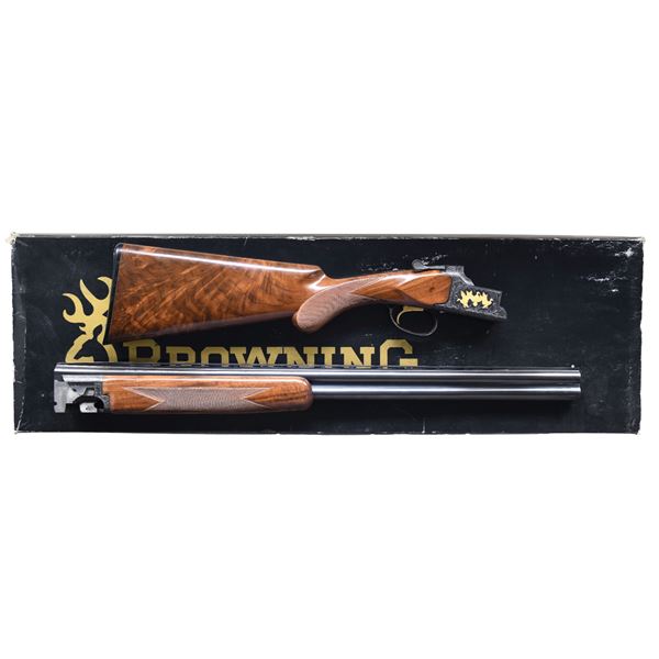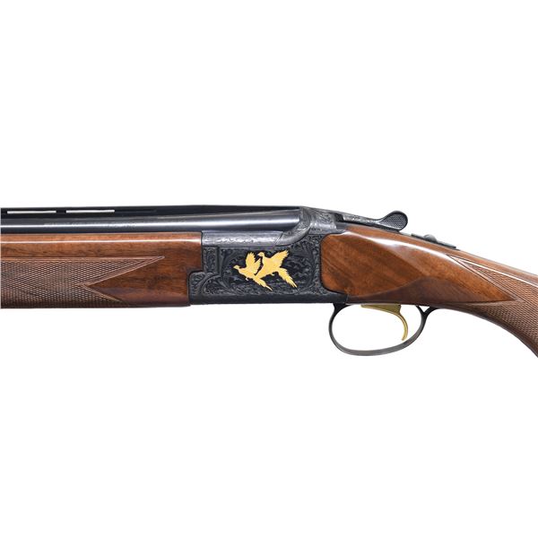 Cal. 20ga 2 3/4" & 3". S# 24253PN963. Bbl are 26" vent rib with Invector chokes. IC, MOD, and FULL choke tubes are included. Blued boxlock action has Grade 6 ornamentation. Right side scene features three gold plated mallard. Left side scene has two flying pheasants. Floor plate has a gold setter and trigger guard shows a flying gold plated quail. Scenes are surrounded by full coverage vine type foliate scroll that extends to forearm iron and breech section of bbls. Lightning forearm and round knob pistol grip stock of gloss finished fancy walnut with cut checkering. LOP: 14 1/8" over original buttplate. WEIGHT: 6lb 8.8oz. UNATTACHED ACCESSORIES: original foam lined black box containing extra choke and wrench. CONDITION: near excellent retaining 99% wood and metal finish. Stocks show a few very small marks. Bright near excellent bores. (25-1469/DS). CURIO. $3,000-5,000.