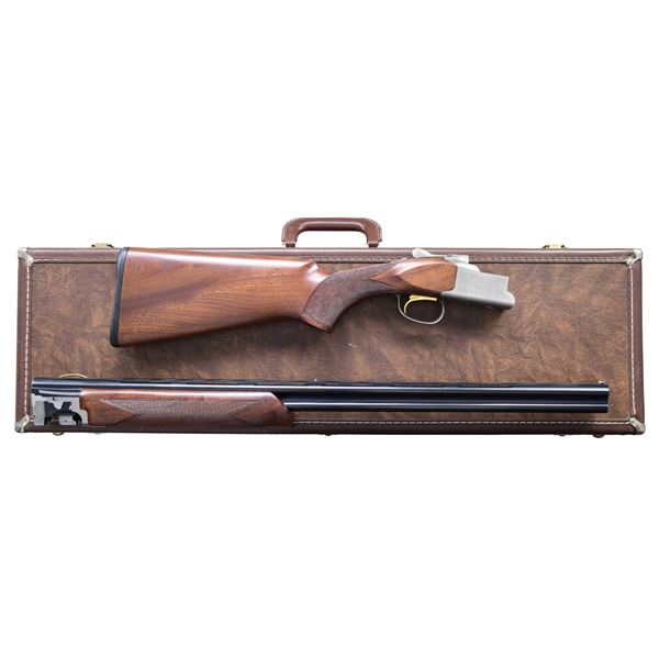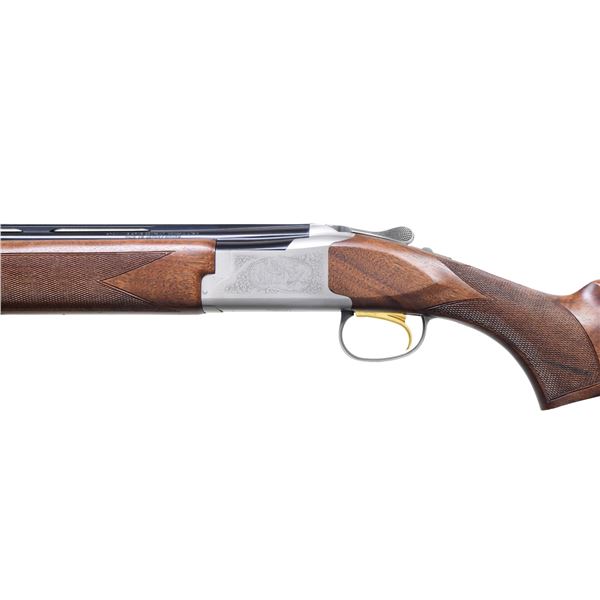Cal. 410. 3". S# 33362ZV131. Bbls. 28" vent rib w/ Invector chokes, set of seven tubes included. White target front sight w/ white mid bead. Silver nitride finished boxlock action. Scroll ornamentation features flying partridge on right side w/ flying quail on left. Gold plated SST. Ejectors. Schnable tipped forearm & flat knob pistol grip stock of satin finished walnut have cut checkering. LOP: 14 1/4" over Inflex Technology thin black pad. UNATTACHED ACCESSORIES: Browning luggage case containing spare chokes, choke wrench, chamber locks, three piece hardwood cleaning rod w/ accessories, instruction manual, NRA card & case key. Also includes original box. CONDITION: near excellent retaining over 98% original finish. Stocks show a few small marks. Bright near excellent bores. (25-911/DS). MODERN. $2,000-2,900.