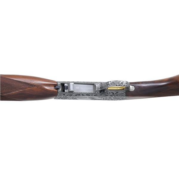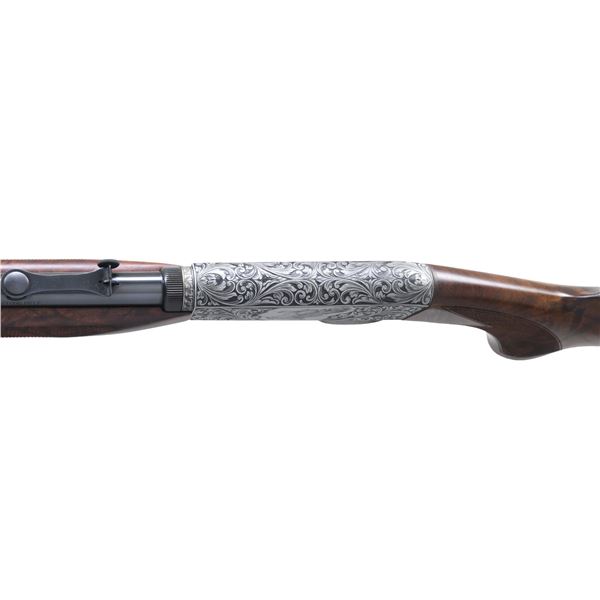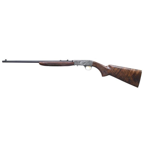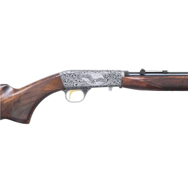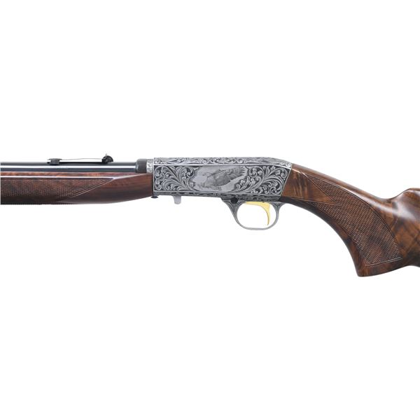 AUTO-LOADING RIFLE. Cal. 22 LR. S# T20766. Bbl. 19 1/4". Blade front sight w/ wheel style rear sight. The action has full coverage hand engraving featuring scenes of flying eagles on both sides. Scenes are surrounded by deep relief foliate scroll w/ shaded backgrounds that extend to trigger guard & bbl. extension. Right scene is signed "R. REIMER". Ron Reimer was trained as a gunsmith at the Colorado School of Trades. He later worked for Herter's until their bankruptcy. In 1990, he began working for Browning Arms in Arnold, Missouri, retiring in 2011 he moved to Wyoming where he still engraves Browning firearms. The President of Browning Arms called Ron a "master engraver in every way". Action has a French gray finish w/ a gold finished trigger. Beavertail forearm & pistol grip stock of satin finished fancy walnut w/ hand checkering. The tubular mag. inserts through the steel buttplate & loads on the right side of the stock. CONDITION: near excellent as upgraded, retaining virtually all wood & metal finish. Bright near excellent bore. (25-893/DS). MODERN. $3,500-5,000.