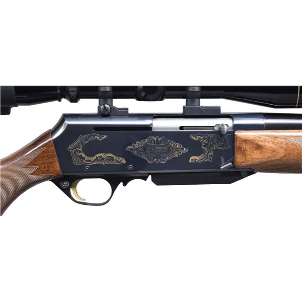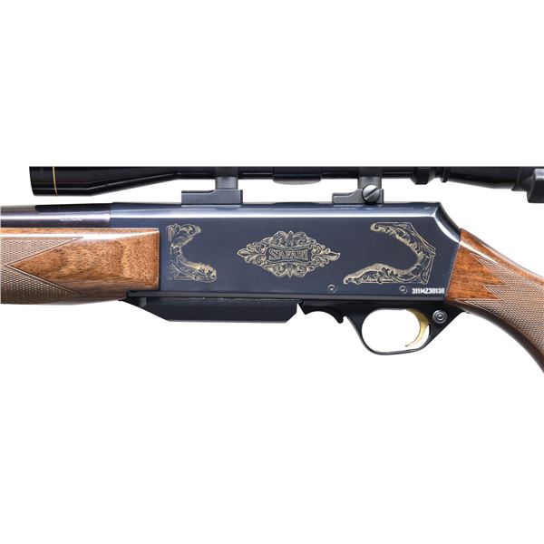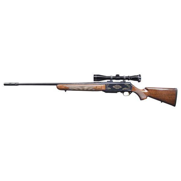 Cal. 338 Win Mag. S# 311MZ30138. Bbl. 24" with BOSS muzzle brake. Rifle is sighted with a receiver mounted Leupold VX-I 3-9x40 scope. Scope has duplex crosshair reticle & very good optics. Folding Butler Creek rear scope cover present. Assembled in Portugal with Belgian parts in 2001. Blued finish with gold trigger & gold colored engraving on receiver with "SAFARI". Glossy finished checkered walnut pistol grip stock & forend with bottom mounted sling studs & factory recoil pad. LOP: 13 5/8". MAGS: 1-3 rd. CONDITION: stock shows scattered handling marks. Metal retains 98-99% original blue with some light handling & operational wear. Action functions properly when hand cycled. Near excellent bright bore. (25-1187/MJC). MODERN. $600-900.