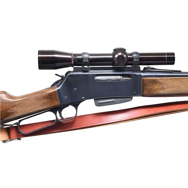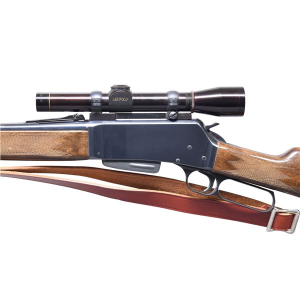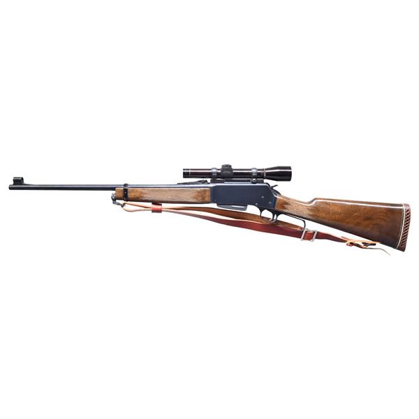 Cal. 358 Win. S# 30231RT127. Bbl. 20". BLR lever action rifle mfg. in Japan and imported by Browning Arms Company. Left side of the bbl. is marked with Browning's importer information above "MADE IN JAPAN", with the model and cal. designations, as well as Browning's patent information marked on the right. Metal components exhibit a blue finish overall, save for on the bolt, which is polished in-the-white. Aluminum bbl. band exhibits a black enamel type finish. Checkered wood straight grip buttstock and forend. Ramped, hooded, and brass beaded blade front sight, with square notch rear sight. Receiver is mounted with a Leupold M8 3x scope. MAGS: 1 4-rd. CONDITION: very good, with metal components retaining the majority of their original factory finishes, exhibiting some light superficial marks from handling and storage. Bbl. band exhibits an area of wear on the left side. Mirror bore, exhibiting several spots of dark pitting, while retaining strong rifling throughout. Wood furniture shows some superficial marks and some scattered impressions from handling and storage, but otherwise remains sturdy and serviceable. Scope retains a clear and sharp optic, with a small black line present in the bottom left. PROVENANCE: From the Estate of Jon Thomas, Gunsport, LTD. (25-1075/MLW). MODERN. $800-1,200.