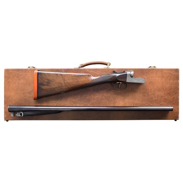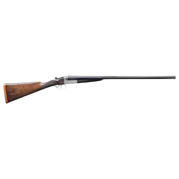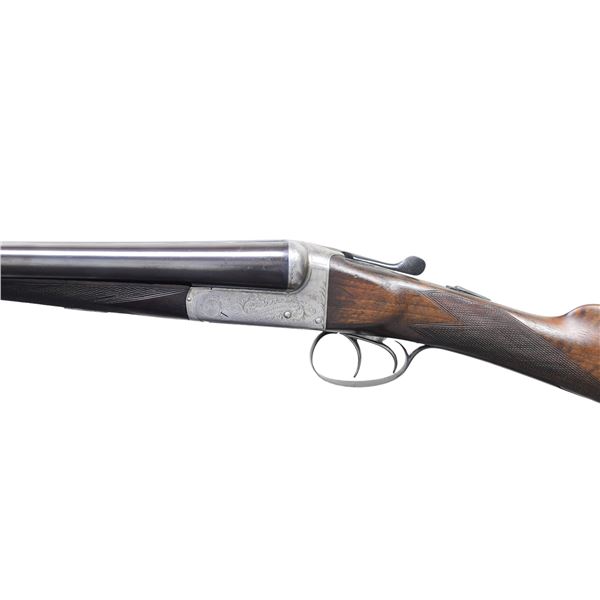 SXS GAME GUN Cal. 12 Ga, 2 1/2". S# 7706. The 28" barrels have swamped game rib with brass bead. Fixed Mod & Full chokes. Water tables shows Birmingham Proofs of 2 different eras indicating professional restoration work, Nitro proofs for 2 1/2" chambers & "13/1" & ".729" barrel thickness. Boxlock action with acanthus scroll engraving. Features dbl. triggers, H&H style ejectors & auto-safety. Checkered walnut stock set. Splinter forearm with push button release & matching numbered iron. Straight grip buttstock with oval toeline name plate. LOP: 14 1/4" to red pad. WEIGHT: 6 lbs., 10 oz. CONDITION: barrels have good re-blackened barrels with prior pitting & marks. Action has gray patina appearance with re-blackened floorplate & triggerguard. Lightly sanded & refinished wood shows re-cut checkering & marks. Shiny bores show scratches & fouling. (24-6930/MD). MODERN. $600-1,000.
