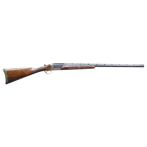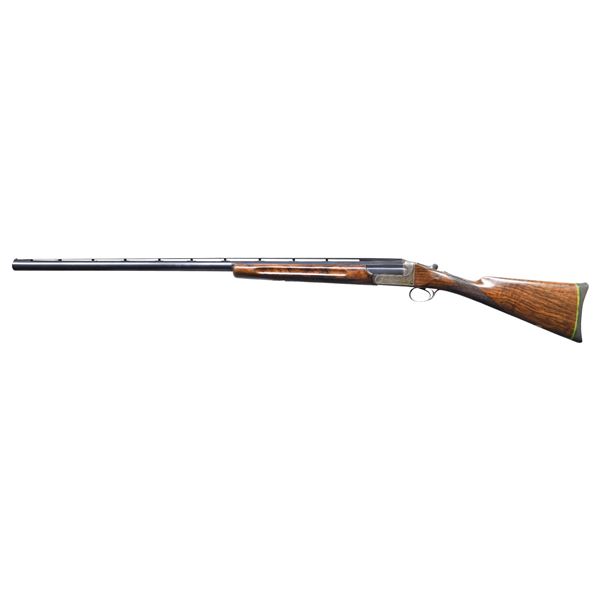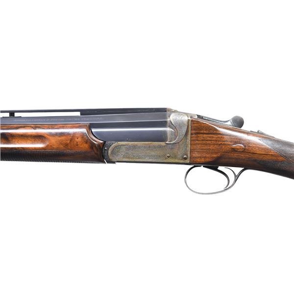Cal. 12 Ga. 2-3/4". S# 15653 (1914). The 32" half round half octagon barrel fitted with slightly raised ventilated rib is engraved with maker's name and address on top right flat and importer "Abercrombie & Fitch" on left. Bottom of barrel is stamped with London nitro proofs for 2-3/4" chamber. Case hardened boxlock action is nicely filed and features blocked out safety and bushed striker. Action is engraved with full coverage very nicely cut rose and scroll. Maker's name is on both sides of action. Blued top lever and trigger guard are also scroll engraved. S# is on trigger guard tang. Attractively marbled and lightly fiddle figured European walnut straight grip buttstock measures 14-1/2" over black Jenkins trap pad. Stock features drop points, point pattern grip checkering and a gold oval on toeline engraved "R.Lettick". Matching large beavertail ejector forend has Deeley release. MEASUREMENTS: BBLS: Bore Diameter: .729. Restriction: .029 (IMod). Wall thickness: .055. STOCK: DAH: 2". DAC: 1-7/16". CAST: neutral. LOP: 14-1/2". WEIGHT: 7 lb. 8 oz. CONDITION: very fine as partially refinished. Barrel with nearly all well done re-black. Action retains nearly all of what appears to be its original case hardening color. Most bright blue remains on top lever and trigger guard. Buttstock appears to be refinished with some loss of detail; a fair scattering of marks are present. Checkering shows light wear. Forend does not appear to have been refinished. Bore is bright and shiny. Action is tight. Mechanically good. (25-216/MGM). CURIO. $1,750-2,500.