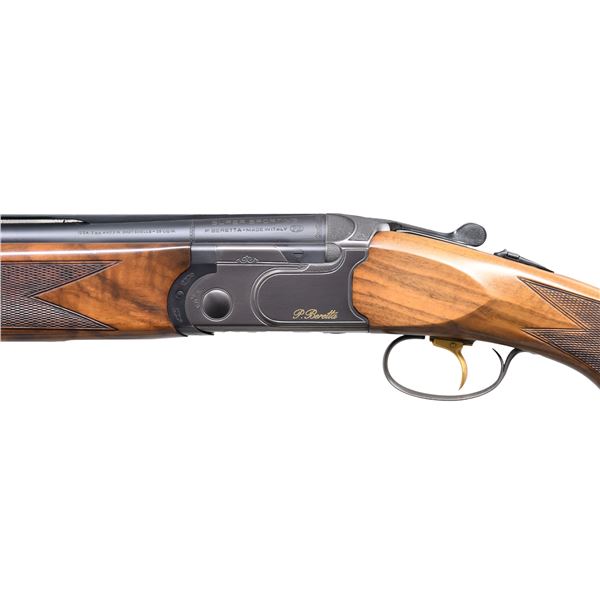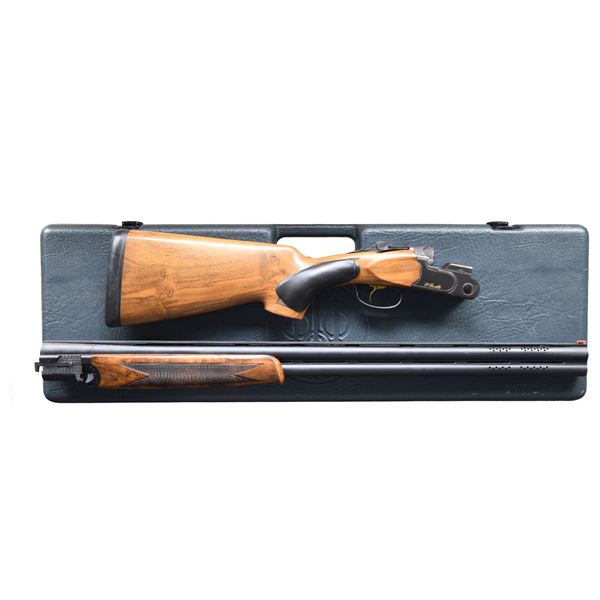 Cal. 12 ga. 2 3/4". S# H18229B. Bbl. 29 1/2" ported w/ vent rib & red fiber optic front sight. Beretta MobileChokes, set of 5 standard & 5 extended stainless steel chokes are included. Matte finished bbl. w/ Greystone titanium nitrate finished receiver. Gold finished trigger is adj. for length. Selective ejectors. Schnable tipped forearm & pistol grip target stock of gloss finished walnut w/ cut checkering. LOP: 14 1/8" over aftermarket Kick-Eez pad. Right side of pistol grip has an added rubberized palm swell. UNATTACHED ACCESSORIES: Beretta molded case containing chokes tubes, choke wrench, stock wrench along w/ spare trigger & sight. CONDITION: over 98% metal finish. Stock shows a few small marks. Very good bright bores. (24-6386/DS). MODERN. $1,600-2,000.