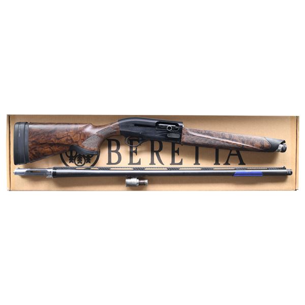 Cal. 12 ga. 3". S# XA260712. Bbl. 32" vent rib w/ Optimachoke interchangeable tubes. Set of 3 extended tubes included. 4 Shot mag. satin gray alloy receiver w/ blue finished bolt. Extended action release & bolt handle. Forearm & pistol grip stock w/ Kick-Off recoil system of extra grain wood w/ oil finish & pressed checkering. LOP: 14 1/4" over Micro-Core pad. WEIGHT: 7 lbs, 11.4 oz. UNATTACHED ACCESSORIES: original box containing spare chokes, wrench, oil & owner's manual. CONDITION: as new w/ box. PROVENANCE: from The Ex-Collection of Gun Sport Ltd owned by Jon R. Thomas. (24-6385/DS). MODERN. $1,400-1,800.