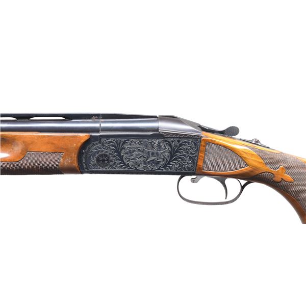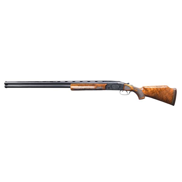 ENGRAVED RECEIVER. Cal. 12 Ga. 2-3/4". S# 2839. The 32" fixed choke barrels fitted with narrow ventilated rib have Krieghoff info and importer (Europa Corporation) on top barrel. Monoblock is marked for I mod and full chokes. Blued action features non-automatic safety and selective single trigger. Action is engraved with near full coverage large open shaded scroll surrounding game scenes on sides; Setter pointing pair of flushing quail on left and three ducks taking wing from a marsh on right. Bottom of action has scroll surrounding "KRIEGHOFF" "MODEL 32". Capped pistol grip buttstock of crotch figured American walnut measures 14-5/8" over white line pad. Stock features Monte Carlo comb, checkered side panels and fleur-de-lis grip checkering. Matching full one piece forend has Deeley type release. MEASUREMENTS: STOCK: DAH: 2-1/16". Drop at rear of Monte Carlo 1-1/4". DAC: 1-1/2+'. CAST: neutral LOP: 14-5/8". WEIGHT: 9 lb. 0 oz. CONDITION: fine to very fine. Barrels retaining nearly all original blue with some high edge wear and a bit of rust near monoblock. Action retains nearly all its original blue. Stocks retain over 90% original finish with some spots and some areas rubbed. Bores are bright and shiny. Action is tight. Mechanically good. Gun information is taped to right side of stock. (25-209/MGM). CURIO. $2,500-3,500.