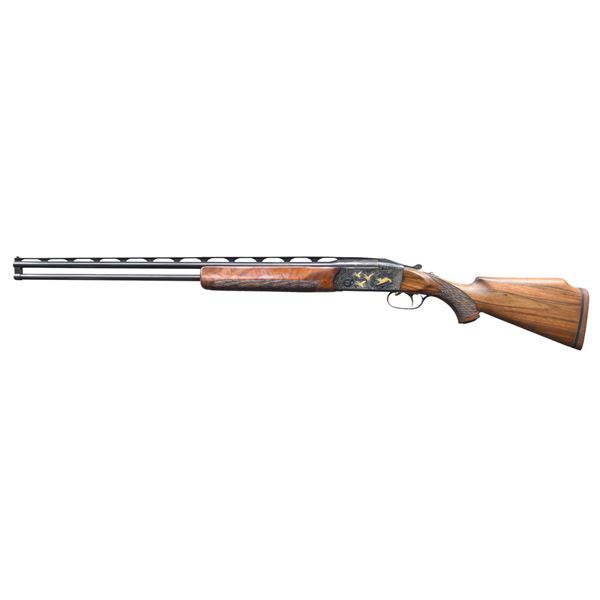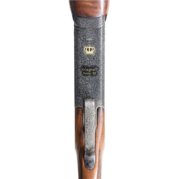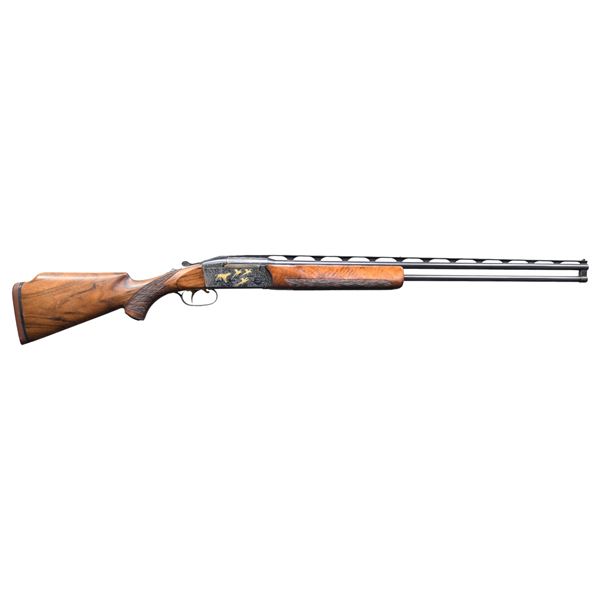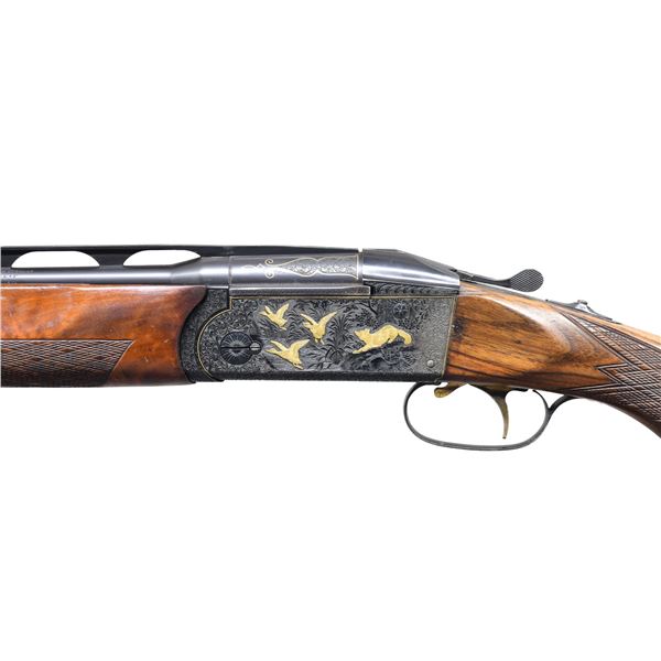 MODEL 32 CROWN GRADE TRAP 410 O/U SHOTGUN. Cal 410, 3". S# 1156. Bbls. 28" Action features full coverage vine type scroll engraving surrounding woodland game scene on both sides. Left side features Gold inlaid crouching fox with 3 flushing gold inlaid mallards. Right side features woodland vignette with Gold inlaid pointer and 3 flushing gold pheasants. Both sides of receiver bear engraver's signature "EB" (Eric Boessler). Gold inlaid crown is found on bottom of action and top of opening lever. Action completely surrounded by gold wire border inlay. Chamber area ornamented with touches of vine type scroll with gold wire inlaid borders. Gold plated single selective trigger. Skip line checkered forend & capped pistol grip Monte Carlo stock with replacement Old English rubber butt pad. LOP: 14" over pad. CONDITION: action appears to have had bluing removed at rear along stock line. Remainder of action retains 97% original blue. Trigger guard has areas of thinning finish. Rear of rib appears to have repair at chamber with 2 1/4" area of missing finish having reapplied matting and a couple pitts. Chamber area near rib also show a couple pitts. Remainder of bbls. retain 95% bluing. Buttstock appears refinished with softening of sharp edges and mismatched lighter appearance. Forend appears original with light wear, small impressions, notable at right side rear, and light handling marks. Bright shiny bores.(25-1370/BH). MODERN. $3,000-5,000.